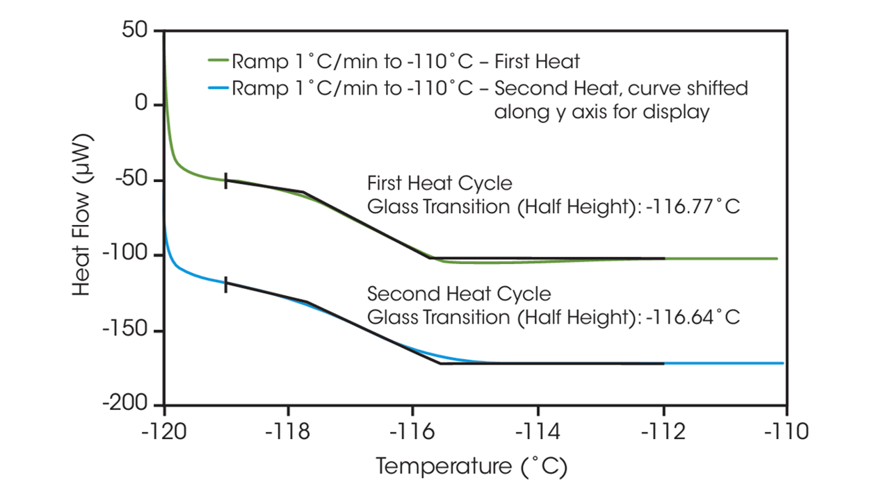 Detecting a Low-Temperature Glass Transition using the RCS 120 The DSC thermogram demonstrates the ease of detecting a very low temperature Tg of a silicone material with the liquid nitrogen-free cooling accessory, the RCS 120.