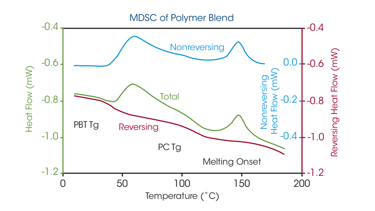 MDSC effectively separates the crystallization of the PBT component into the Non-Reversing Heat Flow, thereby allowing for accurate determination of the glass transition temperatures of each polymer in the Reversing Heat Flow.